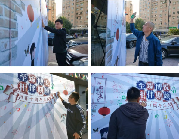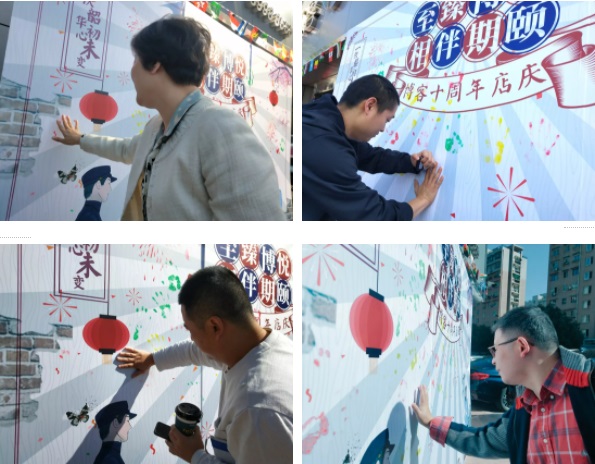 今年店慶別出心裁,連簽名墻也增添了不一樣的色彩,留念方式由簽字改為生動有趣的按掌印了!從當天早上開始營業,新老朋友就絡繹不絕,紛紛前來祝賀,并在簽名墻上熱情按下自己的手掌印,表達自己對紫荊花店的支持和期望~